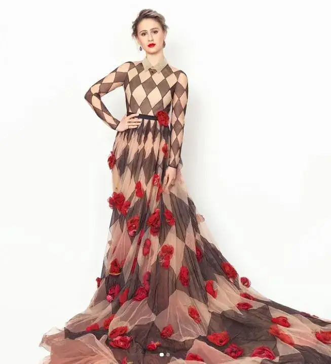 Двете с Мария са искали тоалети за всички награди да са в романтичен и приказен нюанс. Моделът с дълъг ръкав е в черно-бял прозрачен шахматен стил от глава до пети,а към полата са зашити десетки яркочервени рози.
