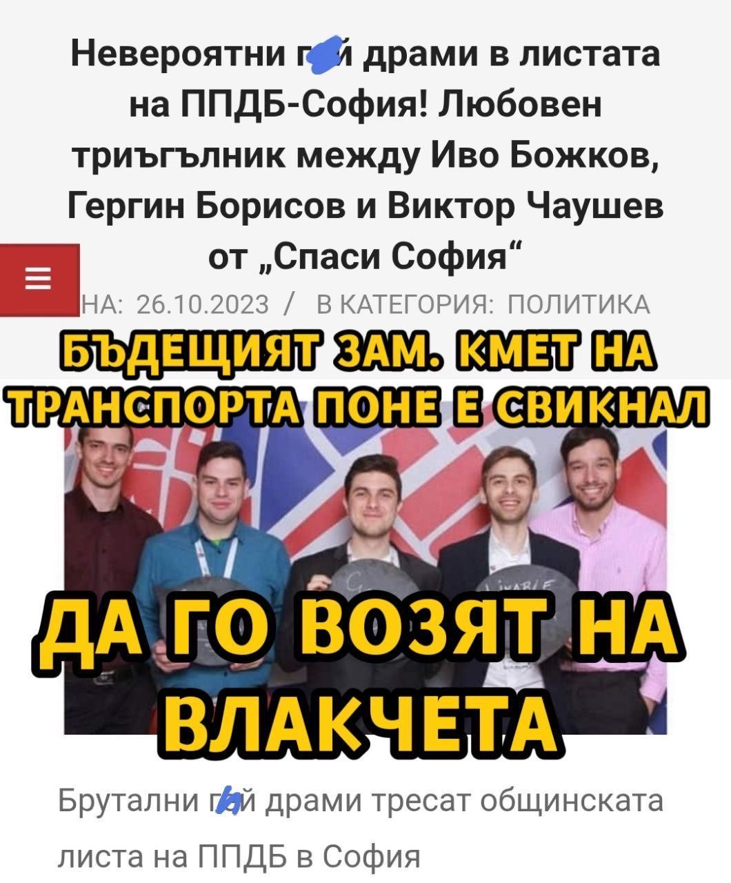 Суингингът при тях датира още от предишните местни избори през 2019 г. Тогава Чаушев, един от петимата основни активисти от „Спаси София“, напусна доскорошните си събратя и мина на другия фронт – като кандидат за общински съветник в конкурентната тогава листа на ДБ. Причината не бе тривиална, а сексуална. Чаушев зарязал интимния си партньор Гергин Борисов (кандидат за общински съветник от „Спаси София“), изневерявайки му с общинския съветник от „Демократична България“ Иво Божков.”, пише ПИК.