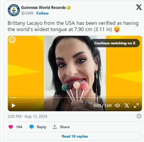 Адвокат Британи се превръща в интернет феномен благодарение на езика си. В най-месестата си част той е дебел почти 9 сантиметра и изпълва устата й, все едно че е поела нещо голямо. Адвокат Лакайо намира за уместно да се плези в мрежата и така да привлича последователи, съответно допълнителен доход. Голямото й постижение в живота е, че може да си сложи на езика цяла топка бита сметана. Проблемът е да я вкара в устата си: „Принудена съм да ям само течна или мека храна на малки парчета и да внимавам, като дъвча, да не го прехапя“, разказва госпожицата из видеомрежите.