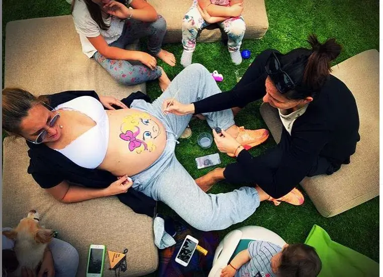 Снимката е от бебешко парти, на което се вижда, как Алекс се е излегнала, докато художничка рисува на корема й момиченце. Така и Раева издаде пола на бебето–дъщеричка.