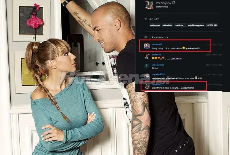 Ники и Алисия си разменят и любовни послания в социалната мрежа. Футболистът публикува снимка на два джипа Мерцедес с еднакви номера, а певицата е коментирала: „Сори, бебчо, но единият е мой“, а Михайлов й отговаря: „Всичко, което имам, е твое“.