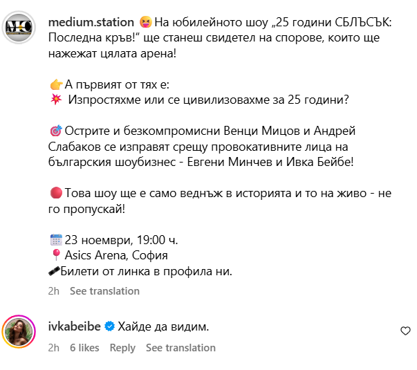 Най-наежена в този спор се оказва инфлуенсърката Ивка Бейбе, на която очевидно й е писнало от постоянните нападки спрямо стойността на нейното онлайн творчество. „Хайде да видим“, заканва се тя в коментар под поста.