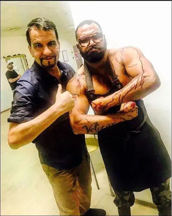 Хелоуин отдавна мина, певецът обаче продължава да се радва на касапската си визия и дори се снима с Ники Кънчев в този вид. Което предизвика доста комични коментари.