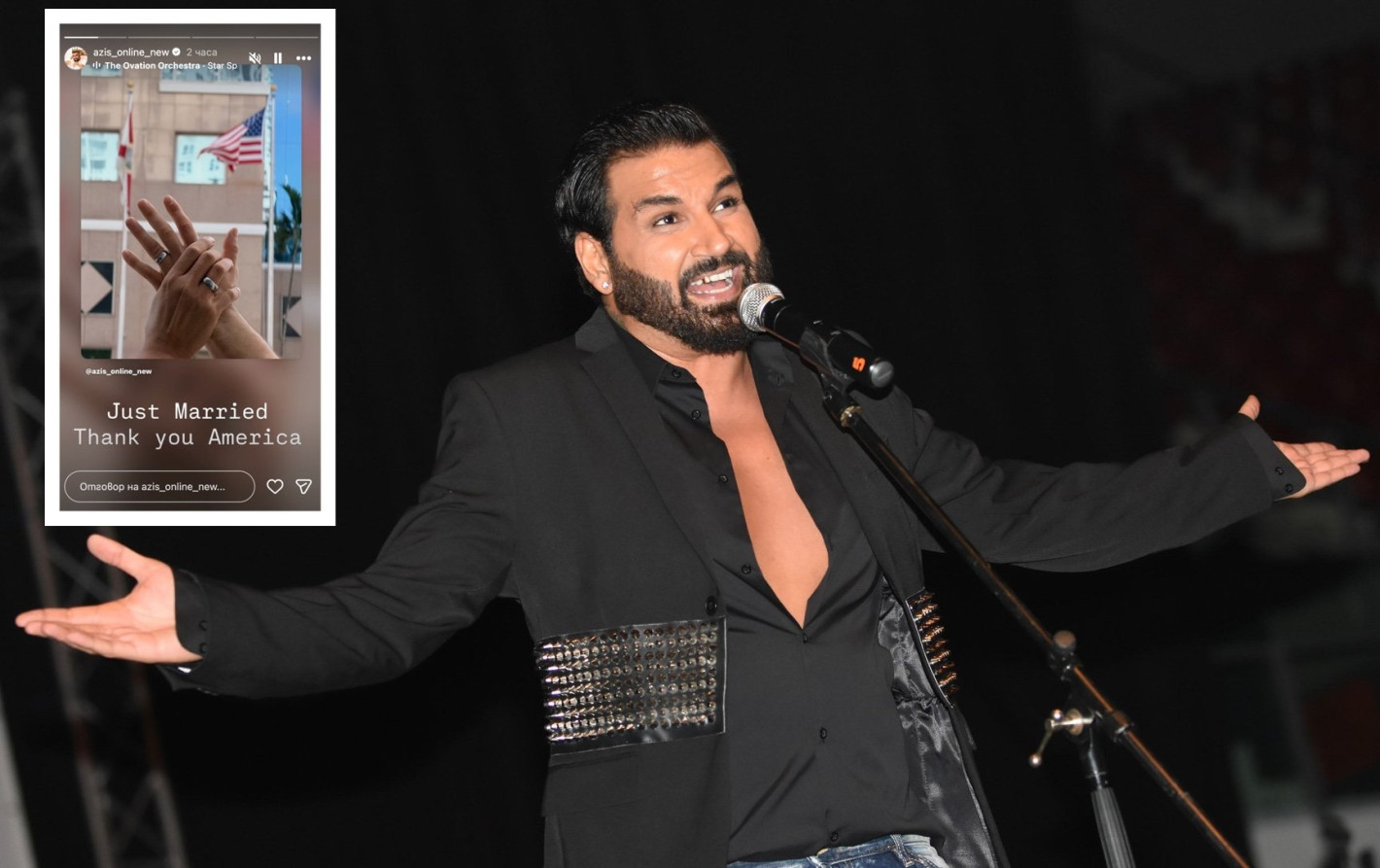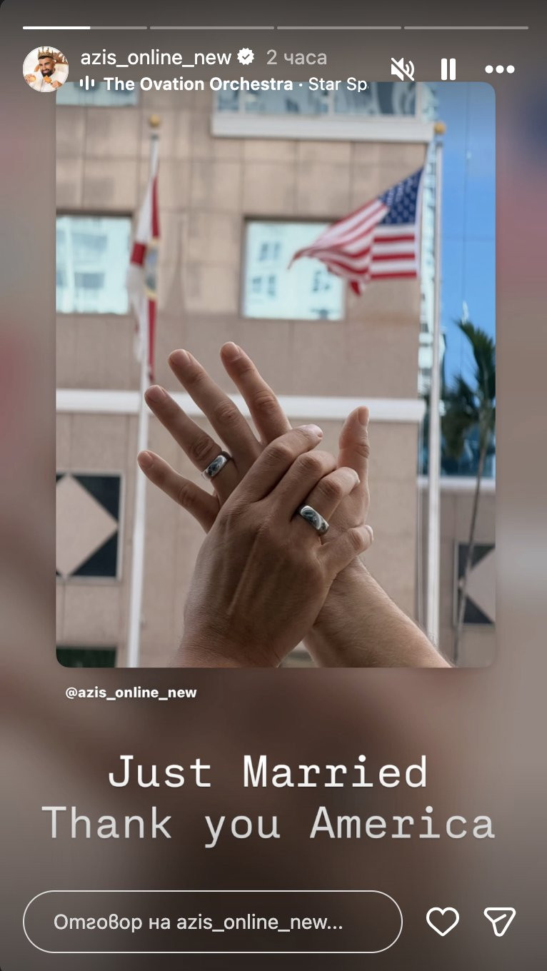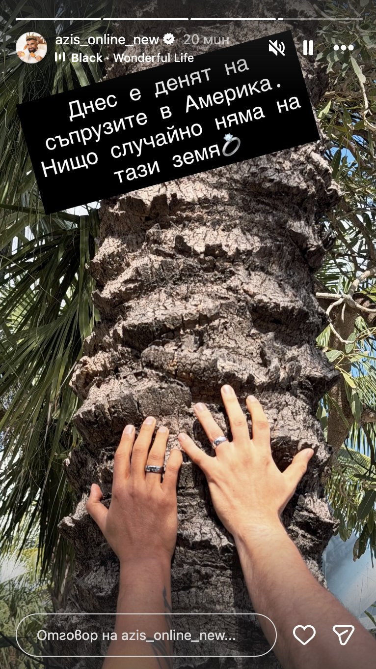 Звездата на поп фолка Азис, роден в Костинброд, направи неочаквано изявление – той се е омъжил в американския щат Флорида! На свой ред, певецът, известен като Васил Боянов, публикува серия от сторита в официалния си профил в Инстаграм, които разкриват шокиращите новини. На един от кадрите се виждат две ръце, носещи брачни халки, на фона на американското знаме, с надпис "Младоженци. Благодаря ти, Америка!"