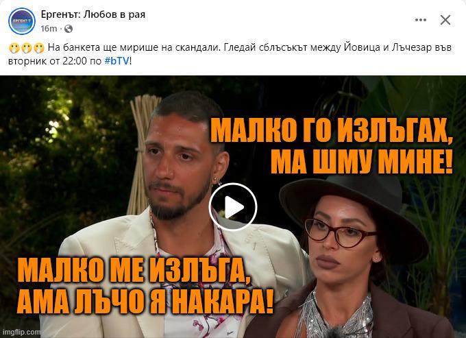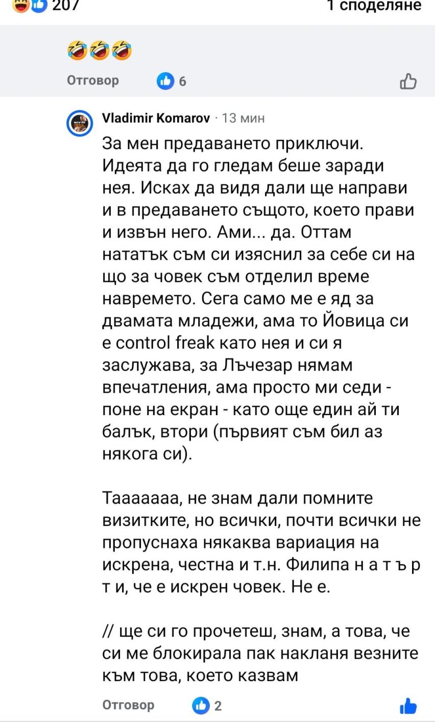 „Исках да видя дали Филипа ще направи и в предаването същото, което прави и извън него. Ами... да. Оттам нататък съм си изяснил за себе си на що за човек съм отделил време навремето. Сега само ме е яд за двамата младежи, ама то Йовица си e control freak като нея и си я заслужава. За Лъчезар нямам впечатления, ама просто ми седи - поне на екран - като още един IT балък - втори (първият съм бил аз някога си).