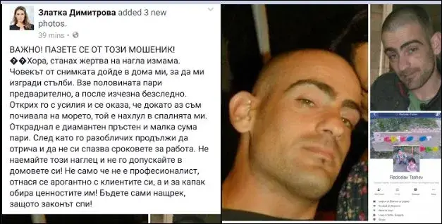 Името на мнимия работник е Радослав Ташев и той се представя като специалист по всичко. Не е ясно как е успял да измами бременната Златка Димитрова, но тявсе още ев ужас от случилото се.