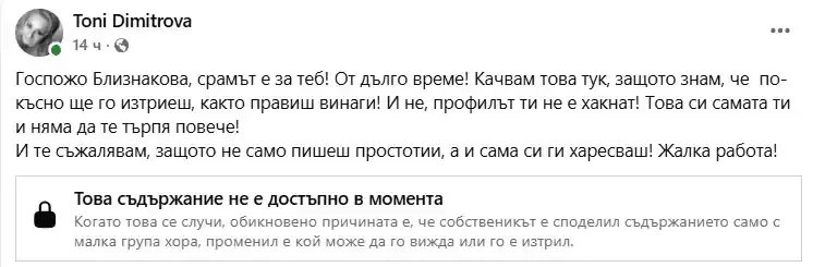 11 Фев 2026Мило момиче надежда дойчева като ти гледам сатанинскио фейскенефбук профил ми мязаш на нарцистичен психопат. Яко сме самовлюбени. Поздрави от Перник.