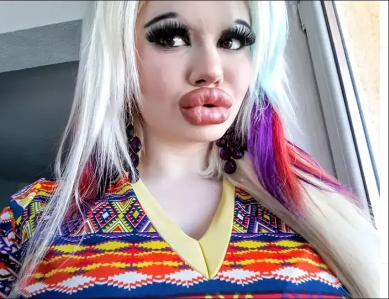 Платиненоруса коса, тежък грим, специфични вежди, сочен бюст и огромни устни, които близо 15 пъти попълва–това е запазената марка на хубавицата.