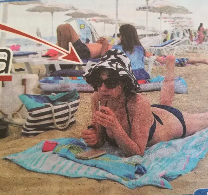 За да не привлича излишни погледи върху себе си, 54-годишната Ризова се бе дегизирала с шапка тип „идиотка“ и огромни слънчеви очила, прикриващи половината от лицето й. За сметка на това бе оставила на показ повече плът, тъй като банският, с който се появи, беше от две половинки, решен в тъмносин нюанс.