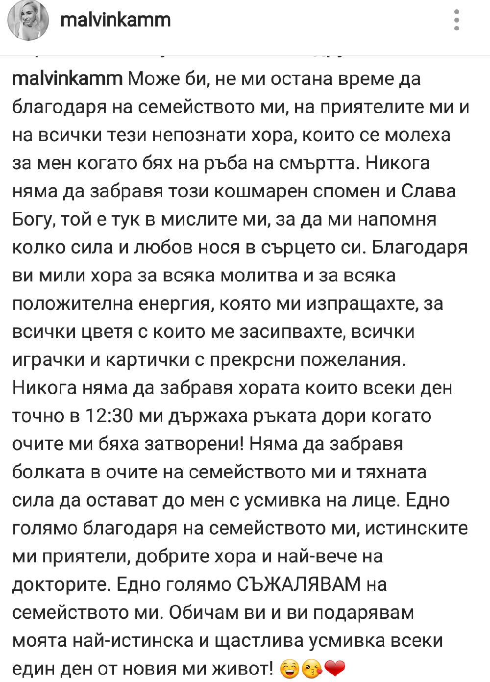 „Може би, не ми остана време да благодаря на семейството ми, на приятелите ми и на всички тези непознати хора, които се молеха за мен когато бях на ръба на смъртта. Никога няма да забравя този кошмарен спомен и Слава Богу, той е тук в мислите ми, за да ми напомня колко сила и любов нося в сърцето си. Благодаря ви мили хора за всяка молитва и за всяка положителна енергия, която ми изпращахте, за всички цветя с които ме засипвахте, всички играчки и картички с прекрасни пожелания. Никога няма да забравя хората които всеки ден точно в 12:30 ми държаха ръката дори когато очите ми бяха затворени! Няма да забравя болката в очите на семейството ми и тяхната сила да остават до мен с усмивка на лице. Едно голямо благодаря на семейството ми, истинските ми приятели, добрите хора и най-вече на докторите. Едно голямо СЪЖАЛЯВАМ на семейството ми. Обичам ви и ви подарявам моята най-истинска и щастлива усмивка всеки един ден от новия ми живот!“.
