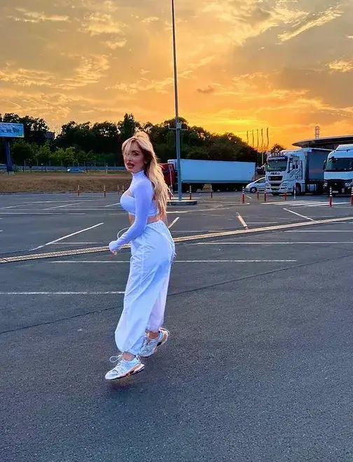Талантливата изпълнителката е облечена в снежнобял атрактивен тоалет и е напълно готова да впечатлява публиката с красота и гласови данни, показвайки, че дори и сред паркиралите коли може да създаде изкуство.