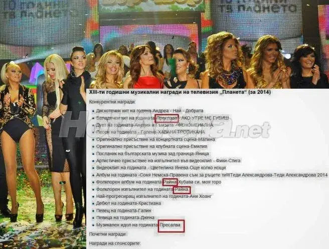 Както съобщихме по-рано, другият сигурен победител ще бъде Преслава, след като Бирмата й уредил наградата Музикален идол на годината. Този приз в последно време стана един от най-желаните и дори по-мечтан от Певица на годината, така че Преслава със сигурност ще остане доволна.