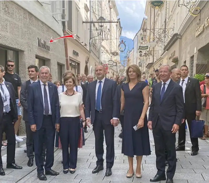 Те се спрели точно пред бутика на престижната марка Макс Мара, която е вечното присъствие в гардероба на Ген. Деси. Първата дама предпочита техните тоалети за почти всички официални събития, на които придружава съпруга си, и притежава десетки техни модни шедьоври, чиито цени не падат под 500 лева. Вероятно Радева е била изкушена и от витрините на Макс Мара във Виена, където най-горещите колекции пристигат по-рано, отколкото у нас. По време на тура покрай бутиците Радеви отново погазиха протокола и се държаха през цялото време хванати за ръце.