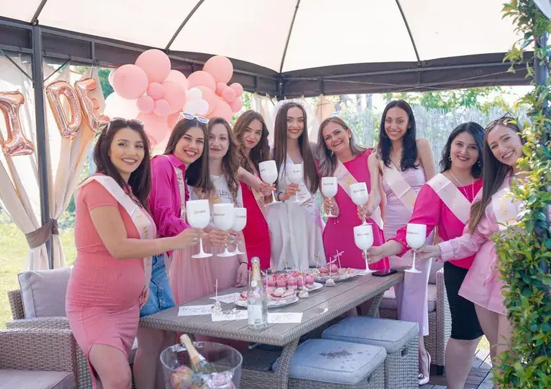Купонът бе във вила, която разполага с огромен двор. Точно там мацките разпъват софрата и вдигат наздравици за бъдещата булка. Дамите са облечени тематично - във всички нюанси на розовото.