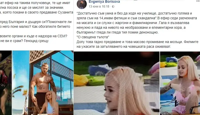 „Достатъчно съм умна и без да ходя на училище, достатъчно голяма и зряла съм на 14, имам фетиши и съм скандална“. В ефир седи разчекната на масата и си служи с жаргони и фамилиарничи. Гала я възхвалява ненужно и пада на нивото на необразовани и елементарни хора, а българинът гледа ли гледа тия помии денонощно. О, свещена тъпота! Долу това гадно предаване и това масово промиване на мозъци. Филмите на ужасите за затъпяването на човешката раса оживяват“, гласеше първият статус на Евгения, който предизвика вълна от коментари.