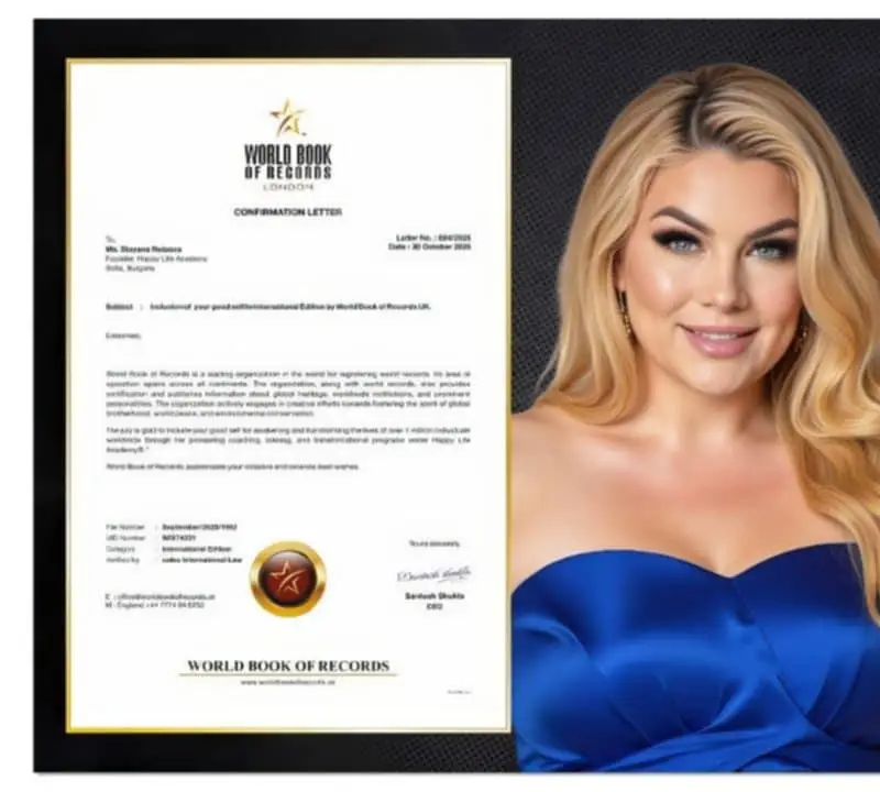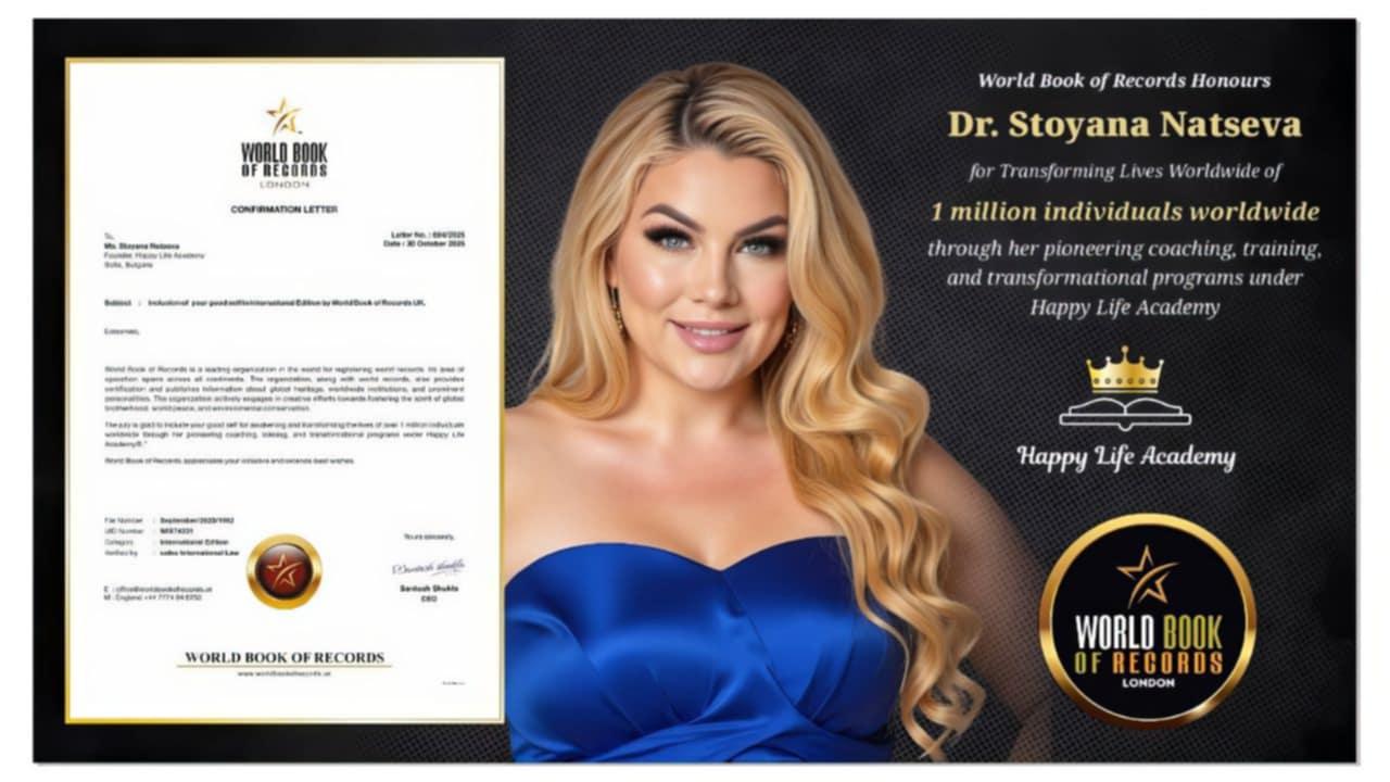 Светът на кoучинга е в шок! Академия „Щастлив Живот“ и нейният основател д-р Стояна Нацева официално получиха два невероятни световни рекорда от World Book of Records в Лондон! Признанията са свързани с трансформацията на живота на над 1 000 000 души по света и с титлата на академията като най-голямата коучинг институция в България, Европа и Великобритания.