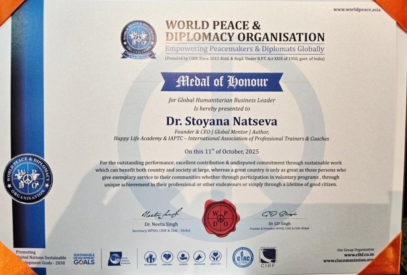 Но това не е всичко! Д-р Нацева получи и Медал за мир за своя хуманитарен принос. Тя заявява: „Мирът започва вътре в нас. Когато човек излекува собствената си болка, спира да наранява другите.“ Тази мисия за пробуждане и вдъхновение е завладяла сърцата на хиляди!