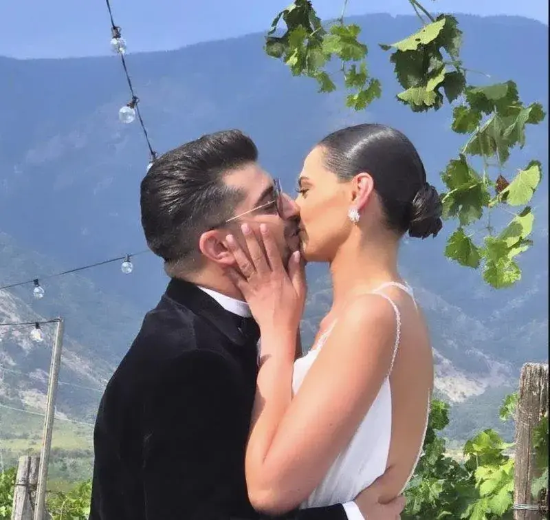 Чаровната булка, която е манекенка, бе облечена с дълга бяла рокля с тънки презрамки, която подчертава хубавата й фигура. Младоженецът бе заложил на стилно черно сако от кадифе, на панталони в същия цвят и на черна папионката.