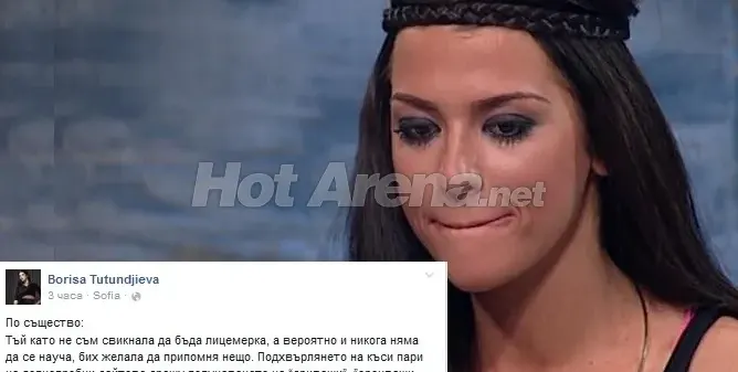 Моделката Бориса Тютюнджиева държи непременно да си изгради имидж на умно момиче, което събира в себе си всички качествени човешки характеристики. Опитвайки се да докаже за пореден път колко е директна и пряма, заформи супер интрига и се оказа точно такава, каквато отрече, че е - лицемерка, видя HotArena.net.