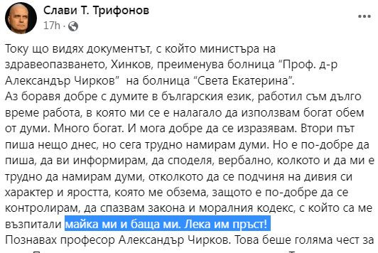 В пост относно преименуваната болница “Проф. д-р Александър Чирков” Слави пише: „…Но е по-добре да пиша, да ви информирам, (…) да спазвам закона и моралния кодекс, с който са ме възпитали майка ми и баща ми. Лека им пръст!“.