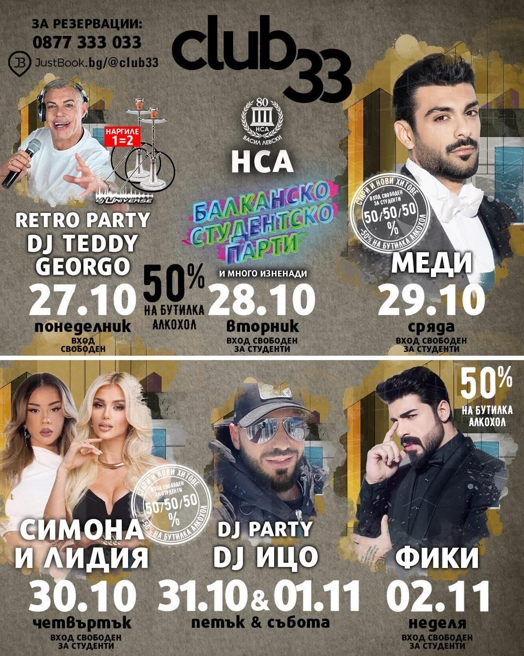 На 30 октомври, феновете на женската красота ще могат да се насладят на Лидия и Симона, които обещават да разпалят мъжките фантазии със своя чар и гласове. Входът за студенти ще бъде безплатен, а класният алкохол ще бъде на половин цена, така че не пропускайте!