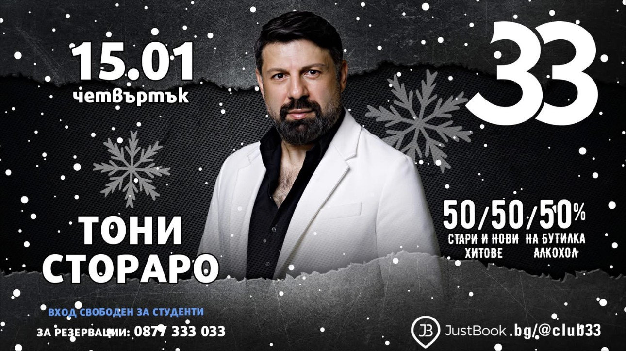 На 15 януари щафетата поема емблемата на модерния фолк – Тони Стораро. Харизма, стил и парчета, които цяла България пее наизуст – Club 33 обещава пълна зала и нажежена атмосфера до ранни зори.