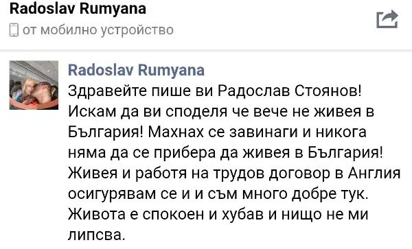 \"Здравейте, пише ви Радослав Стоянов. Искам да ви споделя, че вече не живея в България. Махнах се и никога няма да се прибера да живея в България. Живея и работя на трудов договор в Англия, осигурявам се и съм много добре тук. Животът ми е спокоен и хубав, и нищо не ми липсва“, хвали се Радо.