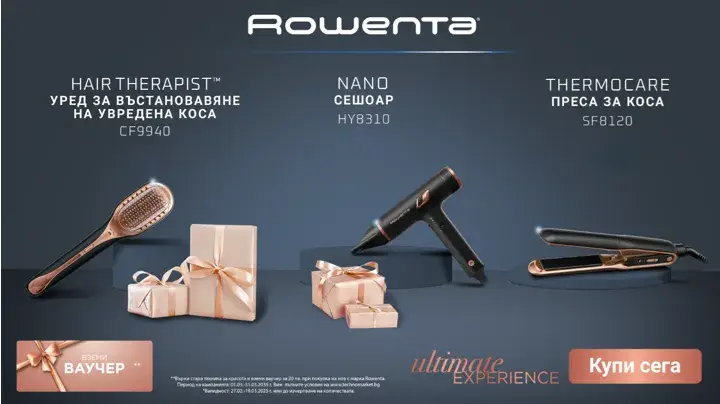 Възстанови косата си с Rowenta Hair Therapist - първата четка с пара, която укрепва косъма и връща здравината му само за 1 месец! Върни стар уред за красота и вземи ваучер на стойност 20 лв. при покупка на нов с марка Rowenta! Разгледай тяхната богата гама от бюти проукти и ги вземи на ТОП цени, с безплатна доставка и на изплащане с 0% лихва от Техномаркет!