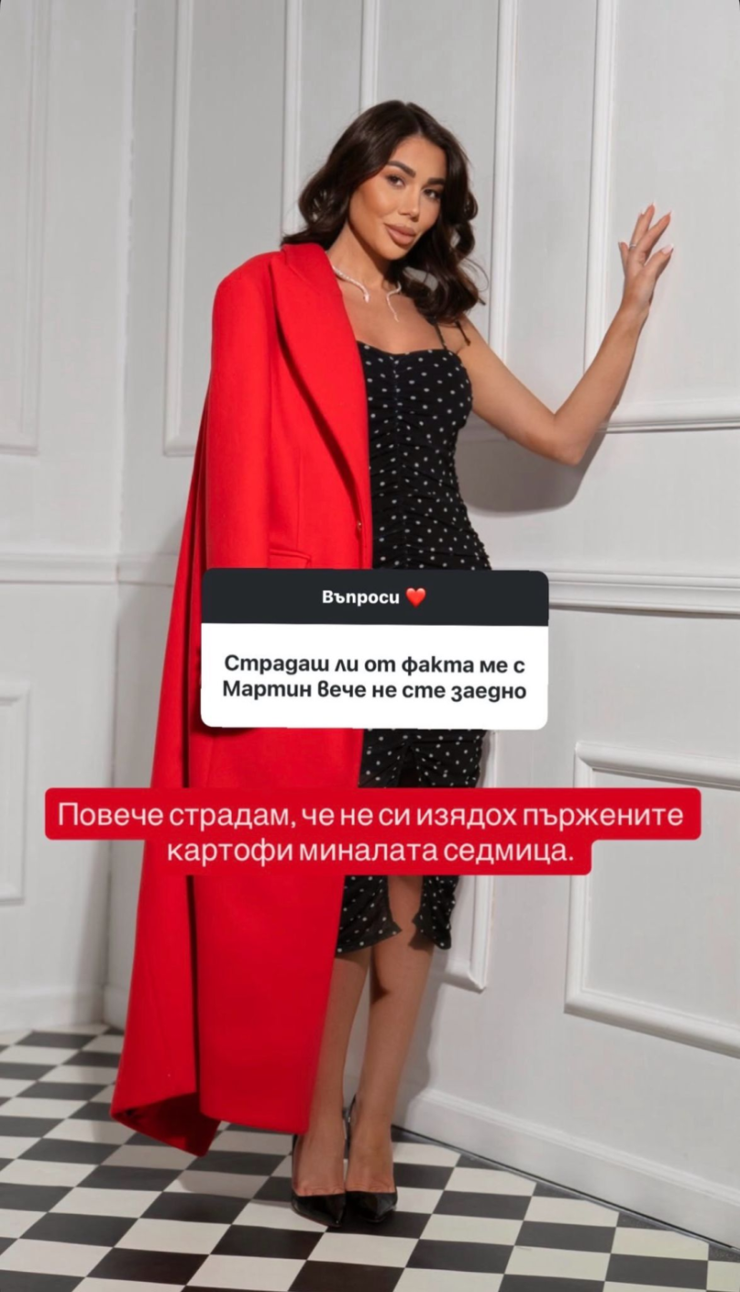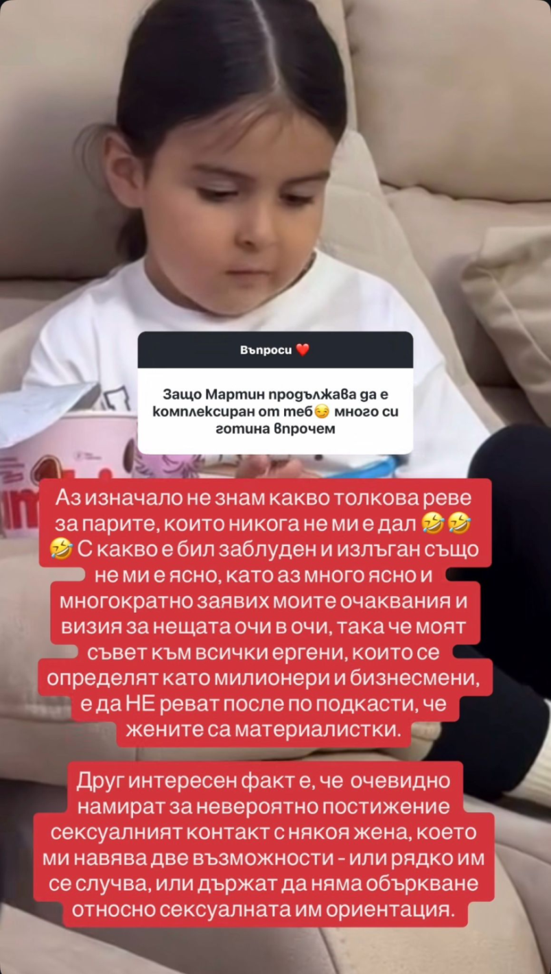 А накрая закова и последния „пирон в ковчега“ на Марто като се изсмя на твърдението му, че са правили секс. „Явно на Мартин рядко му се случва да прави секс, затова толкова държи да тръби публично с коя е спал. Не, не сме правили нищо, защото аз не му дадох. Казвала съм и преди, че лягам с мъж след опознаване и поне 5 месеца срещи. Така че Мартин или е бил зле откъм тези „подвизи“, или пък се бои да го оприличават на гей и затова се хвали наляво и надясно, че е бил с жена“, попиля го чепеларката.