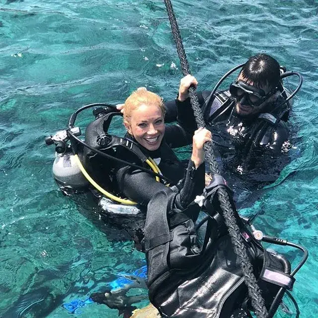Прясната булка сподели кадри от ваканцията си, на които позира с екипировка за гмуркане. Компания й прави новият й съпруг — Жорж Башур, както и синът й Иван Динев, пише „Телеграф”.
