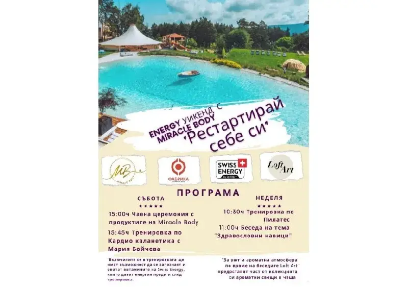 “Фабрика за храна и танци” предлага на малките си посетители многобройни забавления, като батути, кънки на лед, басейн с топки, солна стая и писти за тротинетки. Децата сами приготвят следобедната си закуска – пица изпечена на пещ. А за всички любители на природата има ежедневни походи в гората. Това са само малка част от причините Мария Бойчева – Lady Bulgaria International 2022 да избере именно това място за откриването на новия есенен сезон и представянето на продуктите от бранда й Miracle Body. Но това е само малка част от програмата на предстоящия Energy Уикенд. Участие в него ще вземат водещата марка в областта на хранителните добавки – Swiss Energy, както и Loft ART бранд за напълно натурални ароматни свещи.
