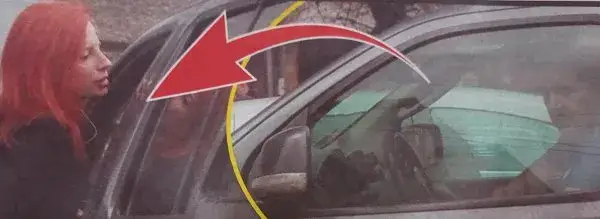 Дамата чинно се реди на опашката и изчаква своя ред, за да влезе в банката. Виждайки, че навалицата е голяма, червенокосата красавица застава до вратата на джипа на любимия си и двамата разменят няколко приказки.