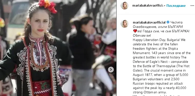 Към поста тя слага картини от сраженията, паметника на Шипка и свои снимки в носия. Бакалова разказа за славната история преди 143 години. Споделя и за битката с безжизнени трупове описани от Вазов. След публикациите почитателите на Мария са изумени от историята на България, за която никога не са чували. И са категорични, че тя трябва да бъде фирмите филмирана. Повечето от последователите на Мария признава, че не са знаели за славното минало на родината й.