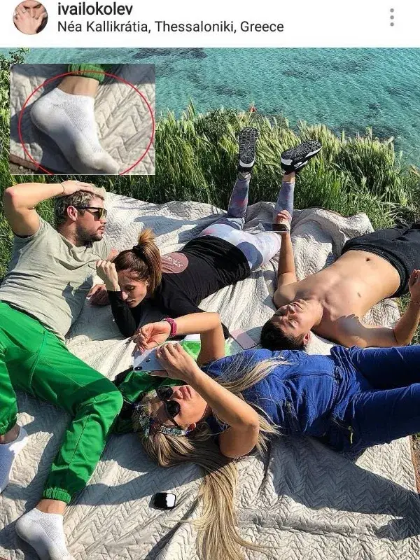 Колев сам се издаде, че елементарни хигиенни навици не са му по вкуса. Нежният фризьор пусна снимка от Гърция в компанията на свои приятели. На пръв поглед нищо необичайно, докато не видите „бялото“ чорапче на Колев. По-точно то е било бяло преди много време. Явно от несваляне и непране сега има противно мръсен вид. Хубавото на снимките е, че липсва миризма. Но можем да се досетим каква е.