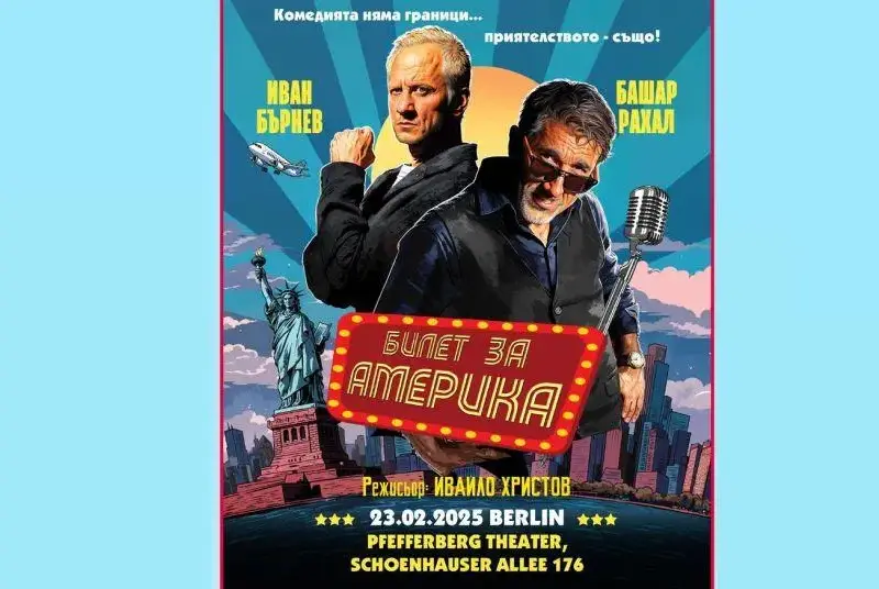 Истински фурор предизвика българската пиеса „Билет за Америка“ в Берлин вчера (на 23 февруари), когато бе дебютът й в чужбина, съобщава Intrigi.bg. Режисирана от проф. Ивайло Христов, постановката представя историята на стендъп комика Емил Гатев (Башар Рахал) и неговия продуцент Сами (Иван Бърнев), които се впускат в поредица от забавни и неочаквани ситуации в стремежа си да впечатлят американска продуцентка и да осъществят турне в САЩ.