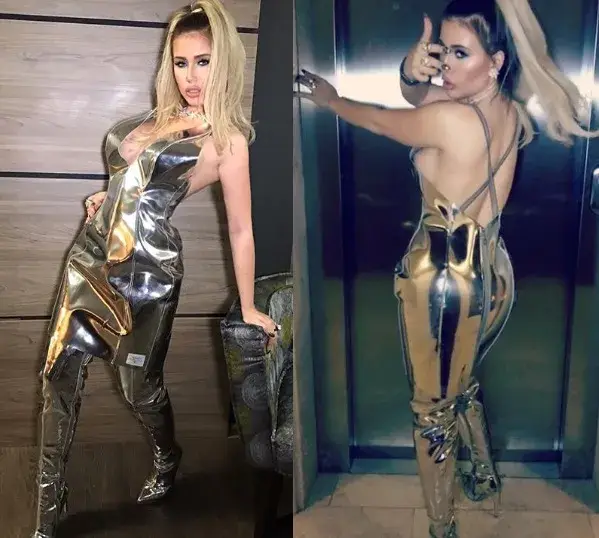 Певицата предизвика истински фурор със снимките, които публикува в Инстаграм. Не само роклята, а и ботушите на изпълнителката са с метален ефект, писа „Телеграф“