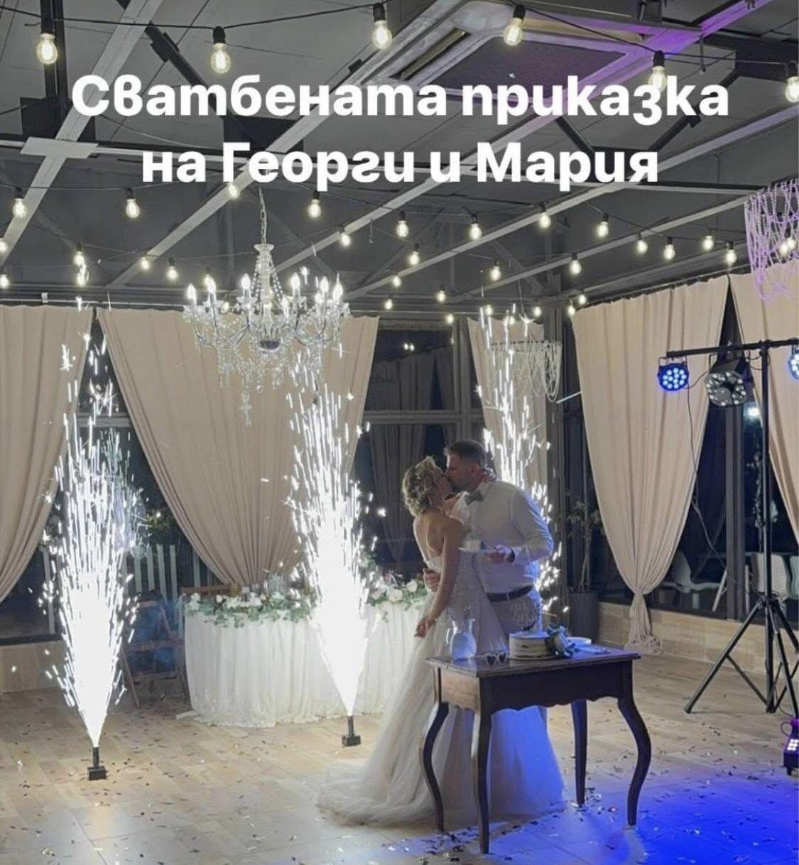 Мария блестеше в ефирна рокля с дантела, а Георги заложи на семпъл, но елегантен стил - костюм и синьо елече с папийонка в същия цвят. Но това не е всичко! По време на купона булката смени роклята с къса и секси визия, което доведе до бурни овации от гостите.