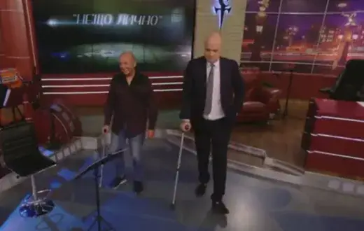 „Съжалявам, но обущата ми са 45 номер. Кракът ми е отекъл. Направих някакъв опит да обуя официални обувки, но не става”, оплака се Годжи. Слави пък се опита да разведри атмосферата в студиото и подвикна на реквизитора Иван Атанасов-Ванката да му донесе патерицата, за да се разходят с Годжи из студиото. Под звуците на песента от култовото анимационно филмче „Пинко, розовата пантера” Слави и Годжи обиколиха студиото, подпирайки се с патерици и бастун.