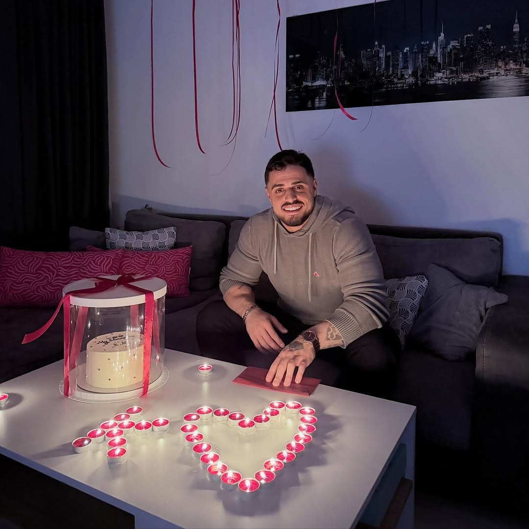 Александра, в типичния си стил, спретна романтична изненада, която оставя без дъх. Вижте само снимките! Карлос е седнал на приглушена светлина, заобиколен от свещи, подредени във формата на буквата К – за Карлос. Какво по-романтично от това? В центъра на всичко е голямо сърце, а по тавана висят балони и торта, опакована с червена панделка.