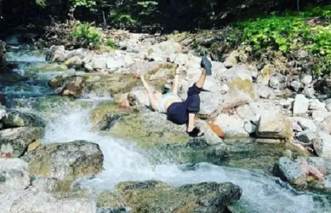 Видимо доволна от преживяването си в планината, Теди написа под снимка: „Да се слееш с природата”, на която се е излегнала върху купчина камъни.