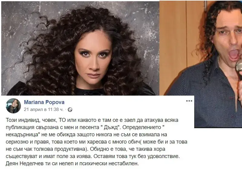 „Този индивид, човек, ТО или каквото е там се е заел да атакува всяка публикация свързана с мен и песента \" Дъжд\". Определението \" некадърница\" не ме обижда, защото никога не съм се взимала на сериозно и правя, това, което ми харесва с много обич( може би и за това не съм чак толкова продуктивна). Обидно е това, че такива хора съществуват и имат поле за изява. Оставям това тук без удоволствие. Деян Неделчев ти си нелеп и психически нестабилен.”