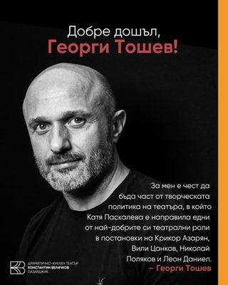 Жоро Тошев, известният телевизионен продуцент, направи неочакван завой в кариерата си, като смени телевизията с театъра! Всичко това се случва само 4 месеца след като напусна Би Ти Ви заради скандал с Венета Райкова. Сега той поема нова роля в Пазарджишкия театър, където ще се занимава с международно сътрудничество. „За нас е истинска чест да приветстваме Георги Тошев в нашия екип“, съобщават от театъра.