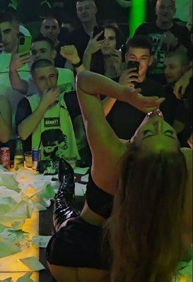 Няма как да не споменем как Киара с поличка, която едва криеше най-съкровените й части, и с шокираща поза, направи шпагат, оставяйки мъжете без дъх. От голото й дупе до бурните шотове, които мяташе, всичко беше на ръба на възможното!