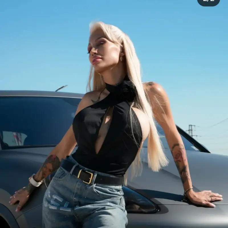 Блондинката е отчаяна и се е подпряла на предницата. На гледката се озовал един мачо с “порше”, който иска да я спаси.
