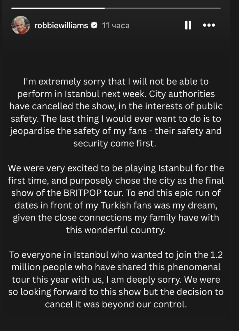 Роби Уилямс отмени дългоочаквания си концерт в Истанбул заради бурни протести и обвини в "ционизъм"! Планираното шоу на 7 октомври в квартал Атакьой е отменено от местните власти след натиск от турски организации. Според тях, 51-годишният изпълнител е "предател на Турция" заради публичната си подкрепа за Израел и еврейския произход на съпругата си Айда Фийлд, родена в Турция.