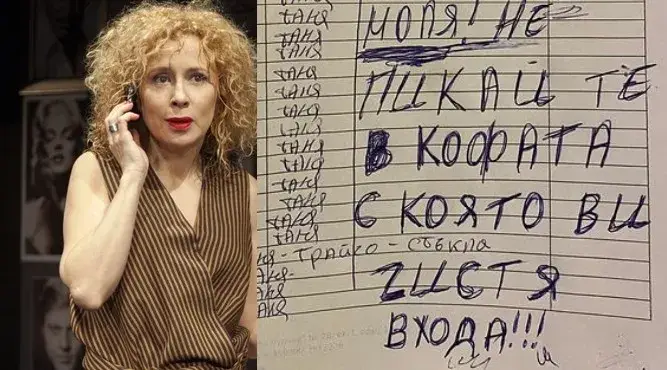 Актрисата показа в социалните мрежи надпис от етажната собственост в кооперацията: „Моля, не пикайте в кофата, с която ви чистя входа!“, гласи съобщението написано от чистачката на входа.