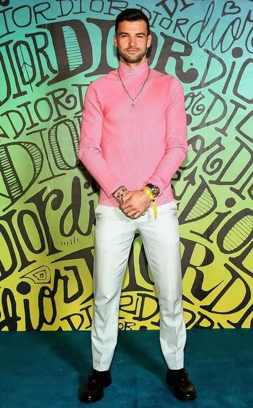 На нея тенисистът позира, облечен в розов пуловер с поло яка, бял втален панталон, атрактивна гривна и дълга верижка на врата.