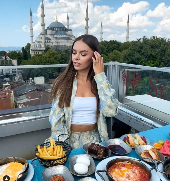 От фотосите й в инстаграм се вижда как крехката рускиня се готви да омете рекорден брой местни специалитети, и то още на закуска. Какво ли ще си поръча пък на обяд в ресторанта на петзвездния хотел над Босфора, може само да се гадае.