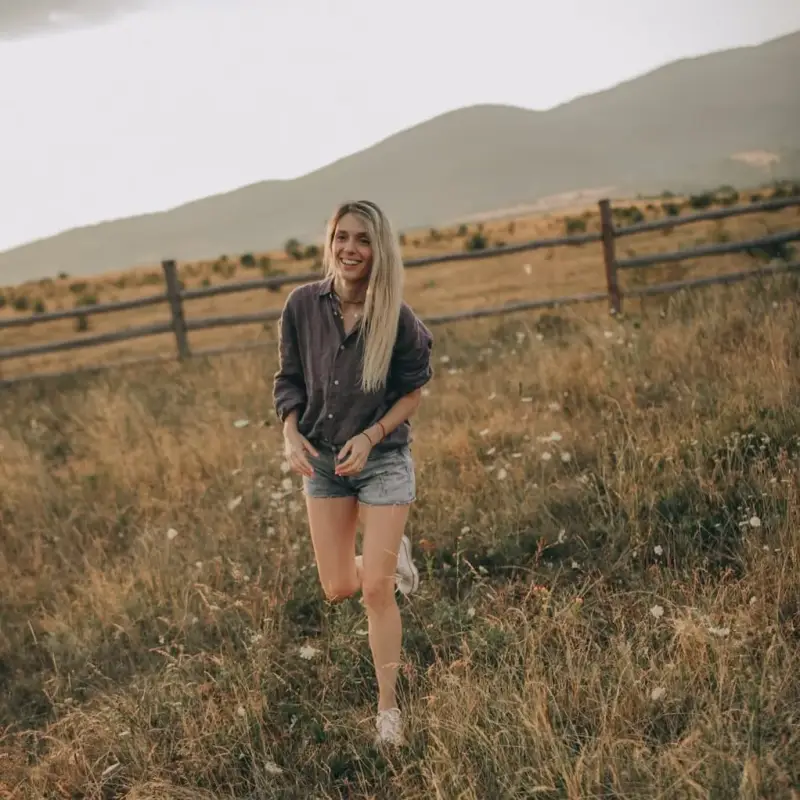 Сред висока трева и топла светлина на залеза Луиза Григорова позира с широка усмивка и небрежна лилава риза.