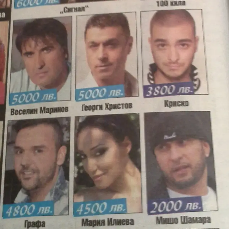 Графа и Мария Илиева пък се навиват срещу 4800 и 4500 съответно, за около час и нещо участие в нощен клуб. Докато Криско може да склони и срещу 3800 лева.